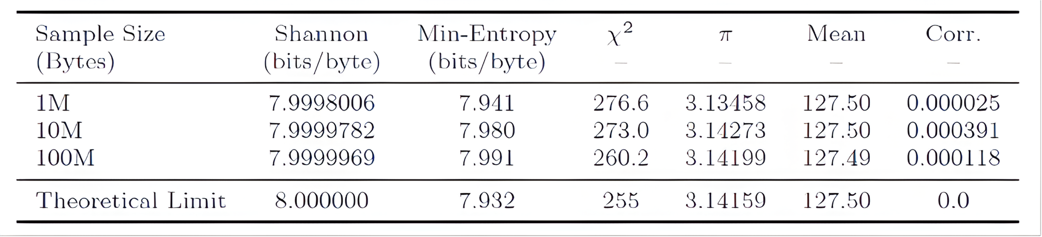 Sustained Security: Consistent results over large datasets ensure that the entropy source does not degrade or become predictable during extended operation.